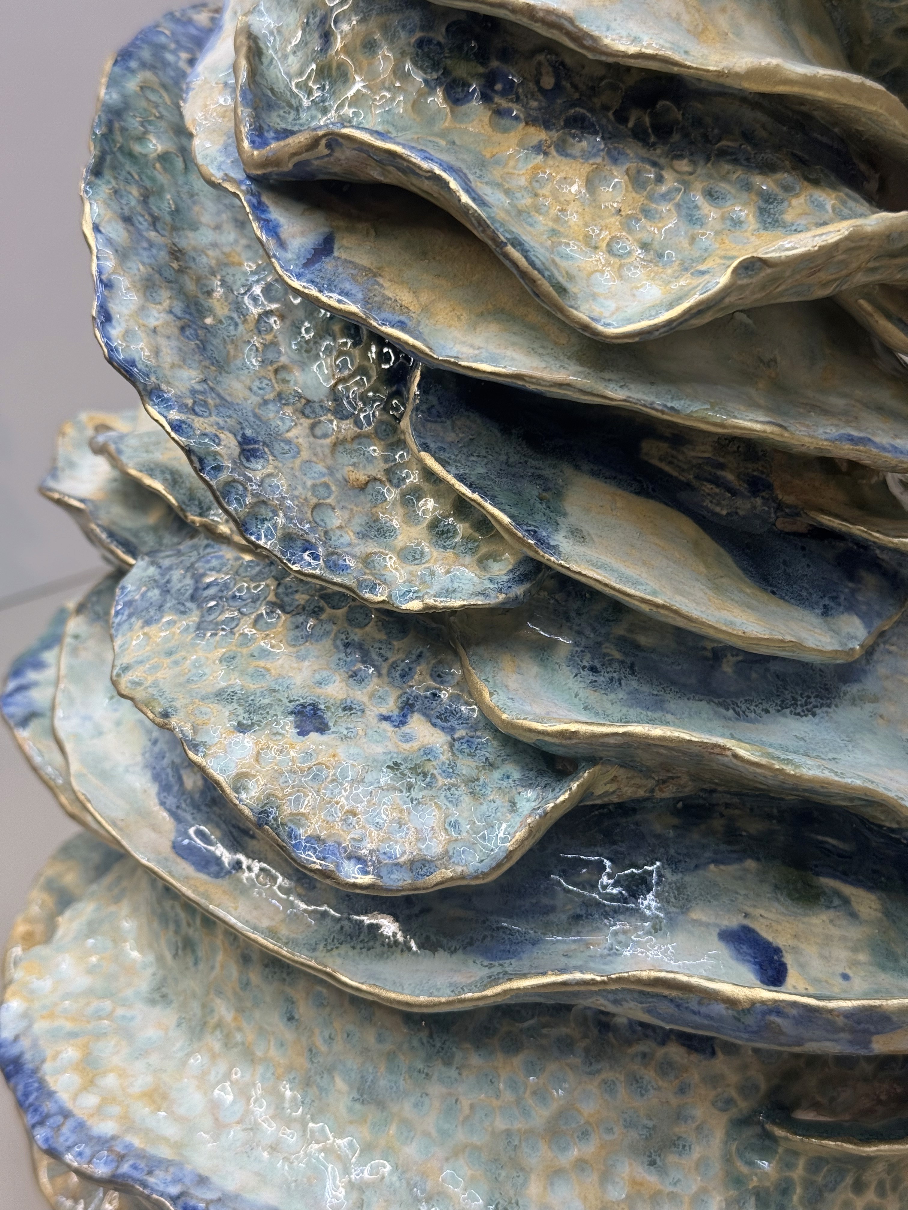 A stunning vase composed of layered forms, finished with a beautiful glaze and gold detailing. Not waterproof; suitable for decorative use only (not for fresh flowers).