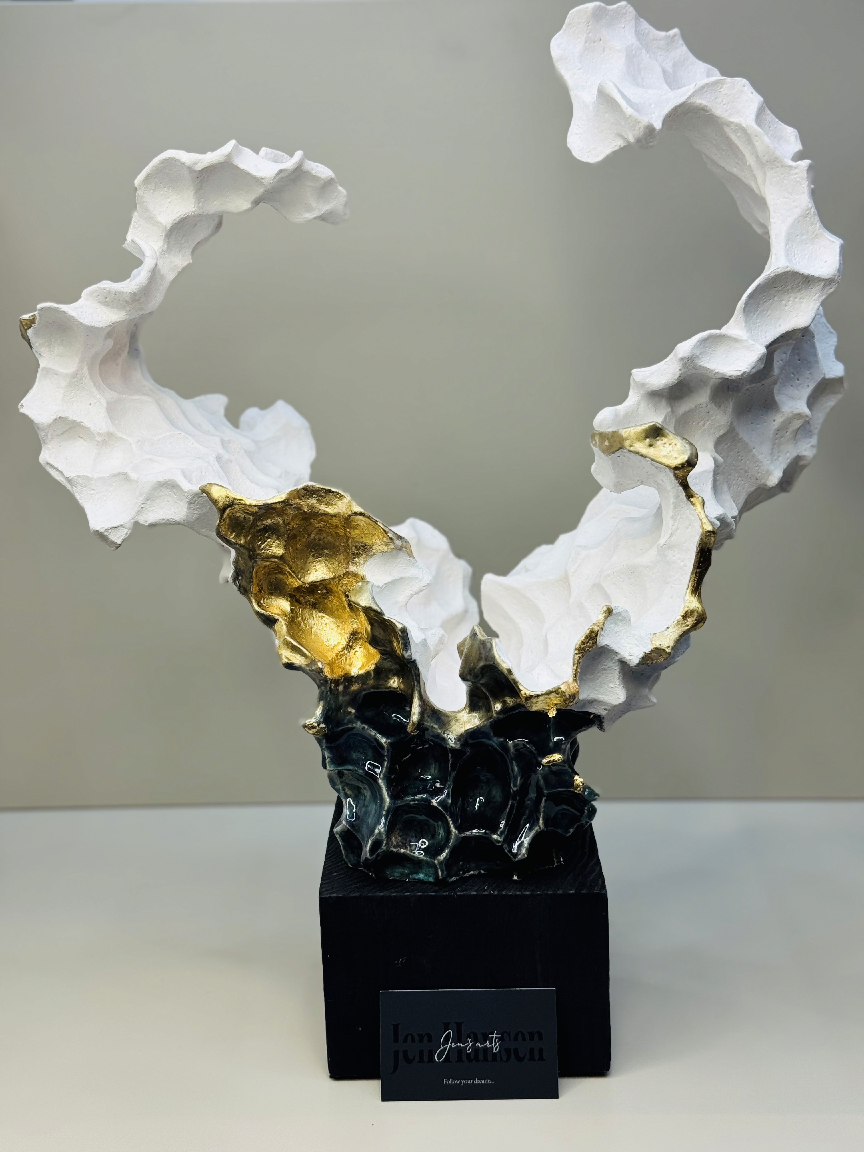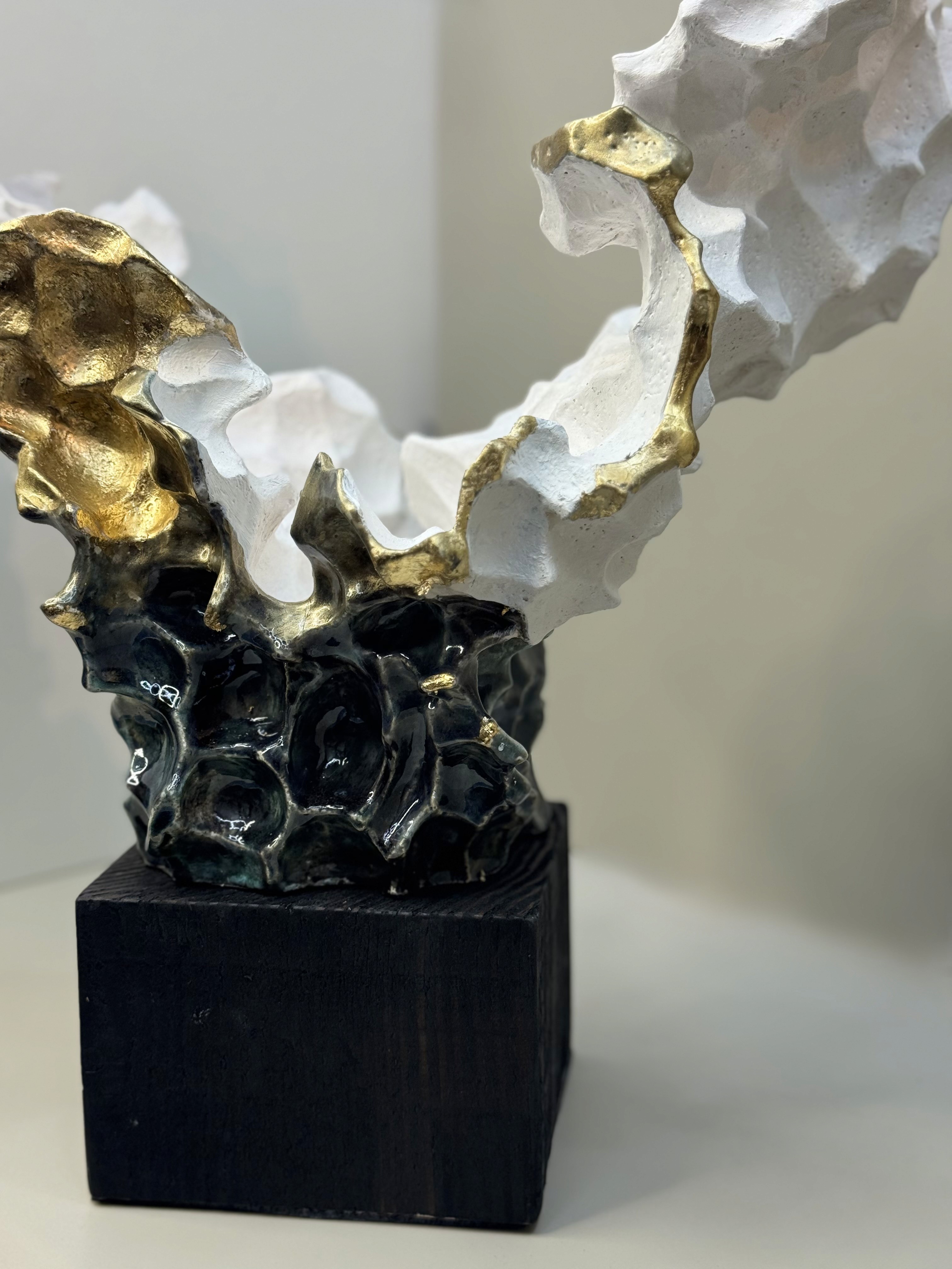 An elegant sculptural piece defined by flowing waves and refined lines, finished in white and enhanced with a multicolored glaze.